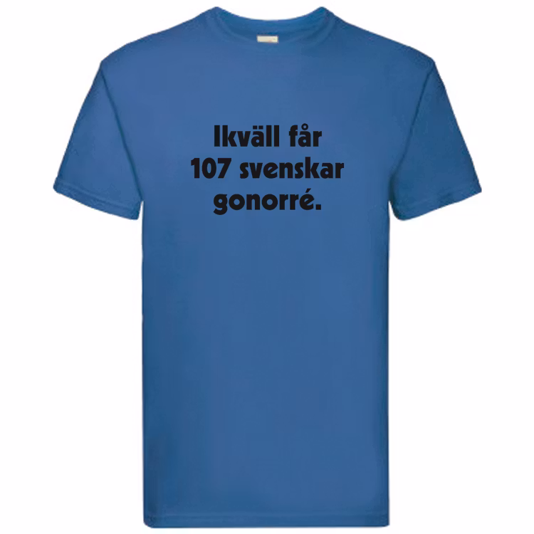 T-Shirt, "I kväll får 107 svenskar gonorré", Svenska Citat Färg Vit Svart Blå Storlek S M L XL 2XL 0 kr 139 kr "Ikväll får 107 svenskar gonorré"Klassiskt svenskt citat från Sällskapsresan.Här får du dessutom original font (typsnitt) på texten, och inte någon som försöker efterlikna originalet.Finns i flera olika färger. Du väljer storlek på T-Shirt. Flera populära produkter T-Shirt, "Ska du inte ha en stänkare?!", Svenska Citat från 139 kr T-Shirt, "Det är mest tröjor och dekaler", Svenska Citat från 139 kr T-Shirt, "Inte fan drack jag så mycket", Svenska Citat från 139 kr T-Shirt, "Man ska fan inte knarka, om man redan är dum i huvudet", Svenska Citat från 139 kr T-Shirt, "Bästa svängen, Hökarängen", Svenska Citat från 139 kr T-Shirt - Det är orimligt! från 199 kr T-Shirt - Don't dip your pen in company ink, Solsidan från 199 kr T-Shirt - Om en ful är tillsammans med en snygg, Solsidan från 199 kr
