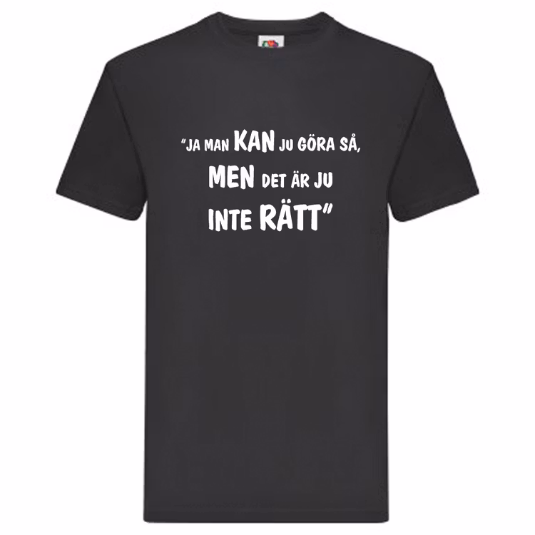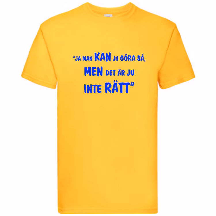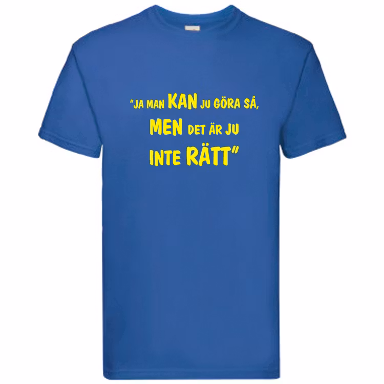 T-Shirt, "Inte rätt", Svenska Citat Färg Blå Gul Vit Svart Storlek S M L XL 2XL 0 kr 139 kr "Ja man kan ju göra så, men det är ju inte rätt"Klassiskt svenskt citat från Yrrol.Finns i flera olika färger. Du väljer storlek på T-Shirt. Flera populära produkter T-Shirt, "Jag ska bli celibat", Svenska Citat från 139 kr T-Shirt, "Du jobbar ju med data!", Svenska Citat från 139 kr T-Shirt, "Det är mest tröjor och dekaler", Svenska Citat från 139 kr T-Shirt, "Hördu din galning, vad gör du", Svenska Citat från 139 kr T-Shirt, "Sol i sinne, brun inne", Svenska Citat från 139 kr T-Shirt, "Man ska fan inte knarka, om man redan är dum i huvudet", Svenska Citat från 139 kr T-Shirt - Du ser mig äta en bajsmacka, Solsidan från 199 kr T-Shirt - Tjenare mannen, Solsidan från 199 kr