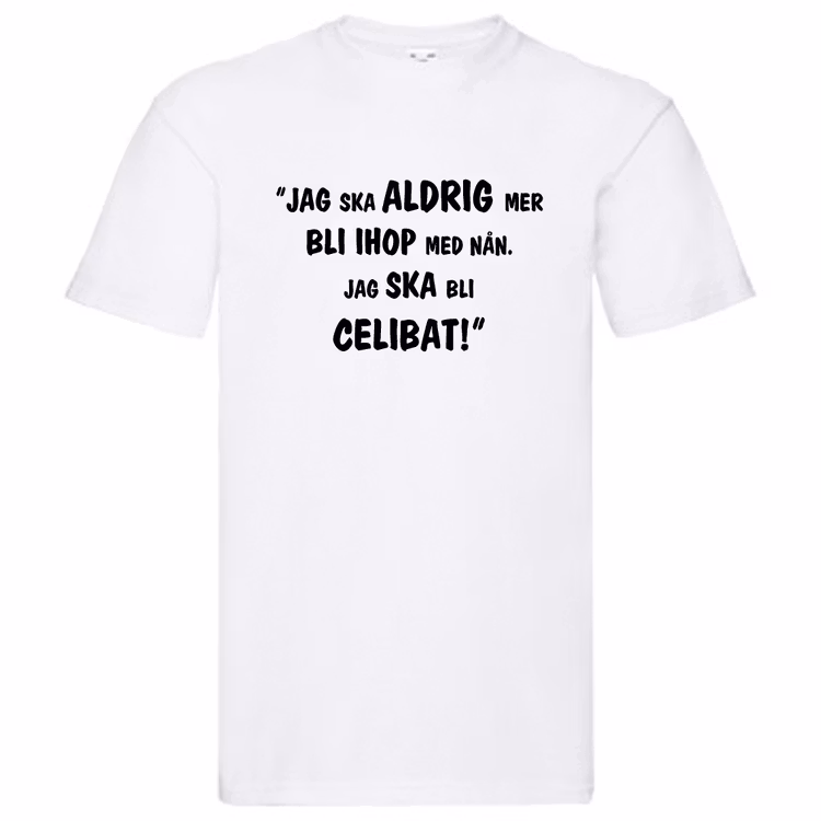 T-Shirt, "Jag ska bli celibat", Svenska Citat Färg Vit Svart Storlek S M L XL 2XL 0 kr 139 kr "Jag ska aldrig mer bli ihop med nån. Jag ska bli celibat!"Klassiskt svenskt citat från filmen Fucking Åmål.Finns i flera olika färger. Du väljer storlek på T-Shirt. Flera populära produkter T-Shirt, "Nykter i morse", Svenska Citat från 139 kr T-Shirt, "Fruntimmer", Svenska Citat från 139 kr T-Shirt, "Jag kan flyga, jag är inte rädd", Svenska Citat från 139 kr T-Shirt, "Jag har närt en kommunist vid min barm", Svenska Citat från 139 kr T-Shirt, "Du jobbar ju med data!", Svenska Citat från 139 kr T-Shirt, "Inte fan drack jag så mycket", Svenska Citat från 139 kr T-Shirt, "Man ska fan inte knarka, om man redan är dum i huvudet", Svenska Citat från 139 kr T-Shirt - Du ser mig äta en bajsmacka, Solsidan från 199 kr