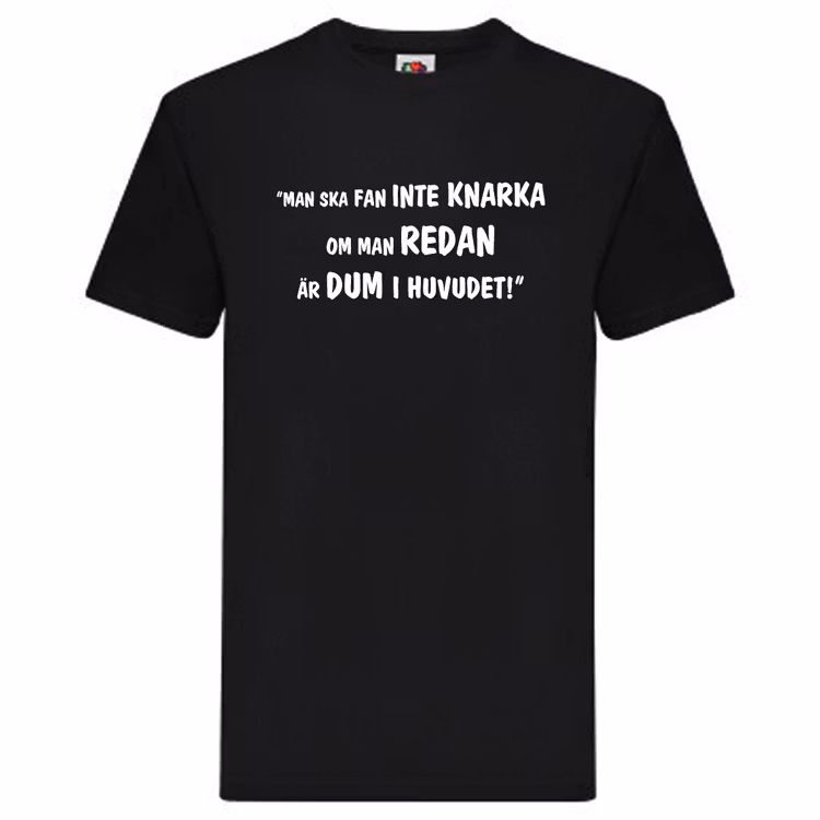 T-Shirt, "Man ska fan inte knarka, om man redan är dum i huvudet", Svenska Citat Färg Vit Svart Storlek S M L XL 2XL 0 kr 139 kr "Man ska fan inte knarka, om man redan är dum i huvudet"Klassiskt svenskt citat från TV serien Johan Falk.Finns i flera olika färger. Du väljer storlek på T-Shirt. Flera populära produkter T-Shirt, "Fruntimmer", Svenska Citat från 139 kr T-Shirt, "Jag ska bli celibat", Svenska Citat från 139 kr T-Shirt, "Jag har närt en kommunist vid min barm", Svenska Citat från 139 kr T-Shirt, "Inte fan drack jag så mycket", Svenska Citat från 139 kr T-Shirt - Hä löns inte förklar för den som int begrip från 199 kr T-Shirt - Du ser mig äta en bajsmacka, Solsidan från 199 kr T-Shirt - Om en ful är tillsammans med en snygg, Solsidan från 199 kr T-Shirt - Tjenare mannen, Solsidan från 199 kr