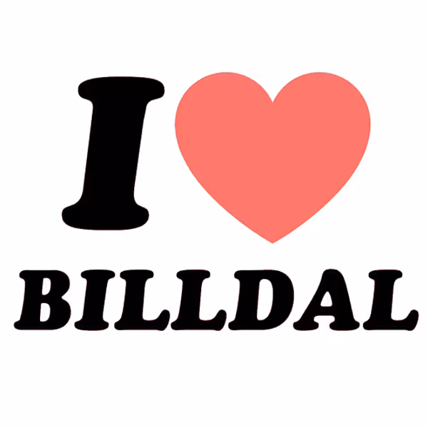 En dekal med texten "I Love Billdal" där ordet Love bytts ut mot ett hjärta.