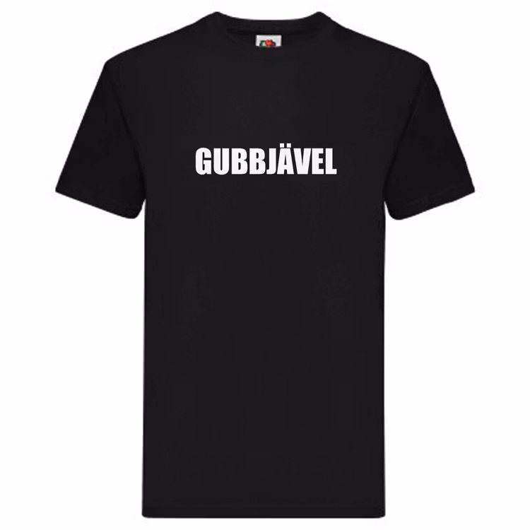 Ordet GUBBJÄVEL rakt över bröstet i svart eller vitt.